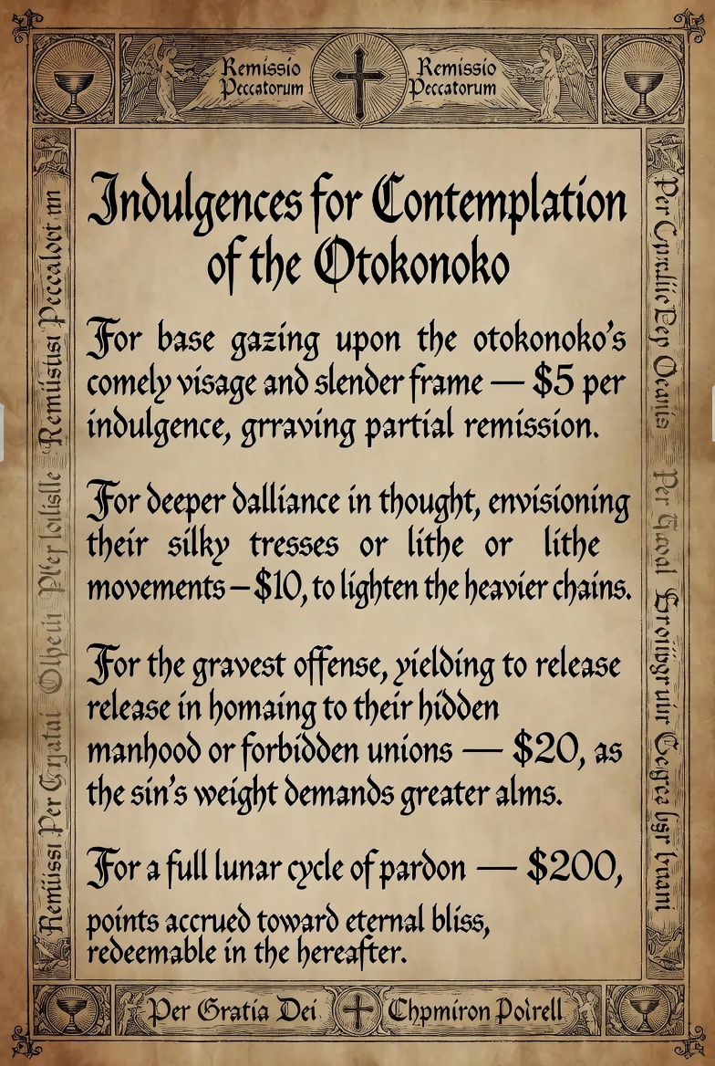 O thou weary pilgrim of the flesh, beset by the tempter's snares in these latter days! Hath thy soul been burdened by the grievous sin of carnal indulgence towards those effeminate forms that mimic the fairer sex, yet bear the mark of Adam's seed? Yea, the unnatural fornication with otokonoko—those deceptive youths arrayed in maidenly guise—doth weigh heavy upon the conscience, drawing thee into the abyss of lustful imaginings. Fear not, for the Holy Mother Church, in her infinite mercy, offereth plenary indulgences to remit such temporal punishments, lifting the yoke of guilt from thy shoulders for a modest oblation.