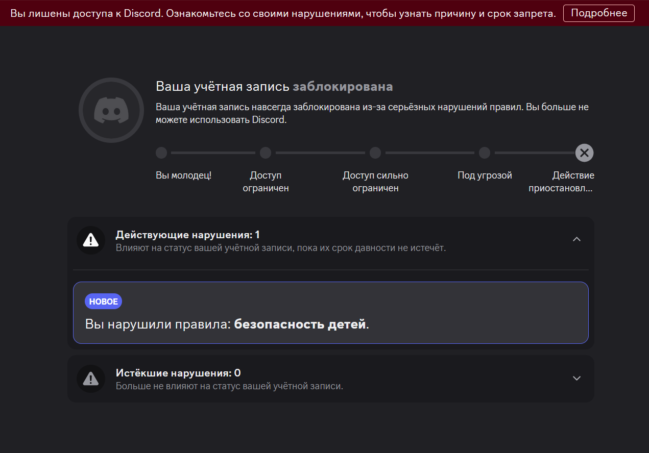 >You have been denied access to Discord. See your violations to know the reason and period of the ban. Details